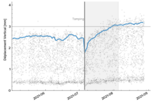 Furthermore, in January 2022, Infrabel also tested the effectiveness of the new pad material as part of its initiative to build the best practice guidelines with the help of KONUX Switch. In this test, a significant improvement in the vertical displacement was observed after replacing the material, allowing Infrabel to validate the effectiveness of the new methodology.