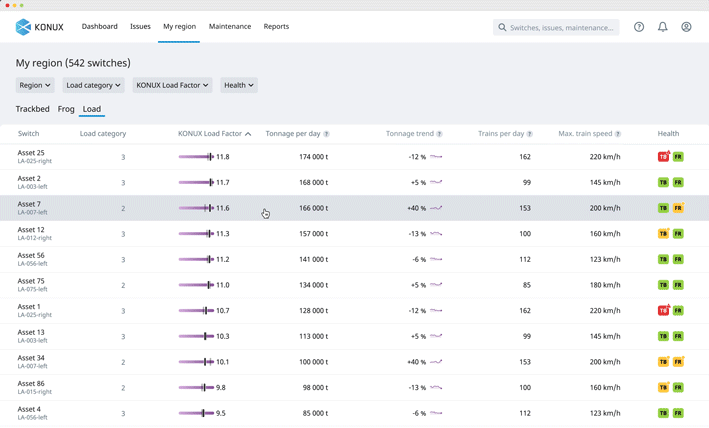 With switch load and traffic insights, KONUX aims to help infrastructure managers efficiently plan inspection and maintenance where and when necessary. The critical parameters extracted from continuous monitoring such as tonnage, speed, train type, and overall train count allow you to analyse the daily usage of individual switches and prioritise the ones under higher pressure than others. This approach can complement the current inspection regime by enabling granular assessment within the existing categories.