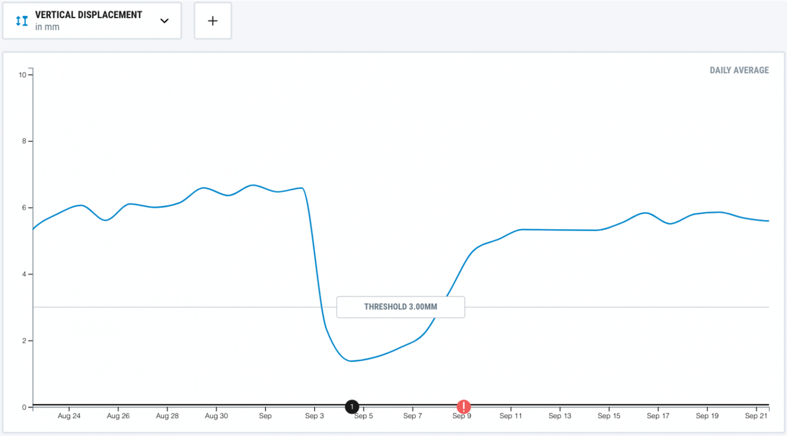 This is an example of unsuccessful tamping: the vertical displacement indicator increase shortly after the maintenance was performed