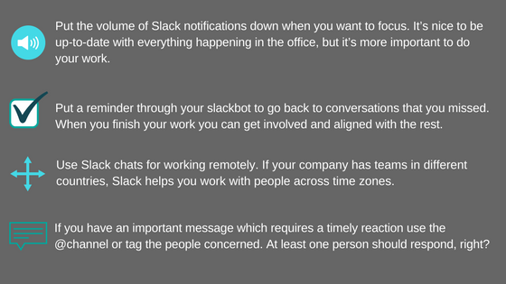 We can also substitute long meetings. Instead, we get answers on the spot, and the good thing is that we can concentrate on other tasks as well. Organising a private channel lets us invite only the people we need and add colleagues who otherwise couldn’t attend. Meetings over Slack are then compiled in digestible pieces of information that are easily retrievable. Even if we miss a point we can go back to it, something that we won’t be able to do after a meeting.